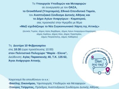 Τη Δευτέρα 10 Φεβρουαρίου 2025 και ώρα 10.00 θα πραγματοποιηθεί η Ημερίδα με θέμα «Μαζί σχεδιάζουμε το Νέο Συγκοινωνιακό Χάρτη της Αττικής» που συνδιοργανώνεται από το Υπουργείο Υποδομών και Μεταφορών, σε συνεργασία με τον ΟΑΣΑ, το Growthfund (Υπερταμείο), το Εθνικό Επενδυτικό Ταμείο,τον ΑΣΔΑ και τον Δήμο Αγίων Αναργύρων Καματερού στο Κέντρο Τέχνης και Πολιτισμού «Μαρία-Έλενα». […]