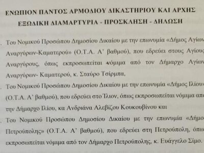 Εξώδικο Δήμων Αγ. Αναργύρων-Καματερού, σε Δ.Ε.Δ.Δ.Η.Ε. για τις επαναλαμβανόμενες διακοπές ρεύματος…