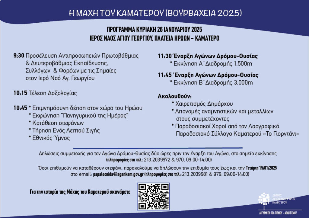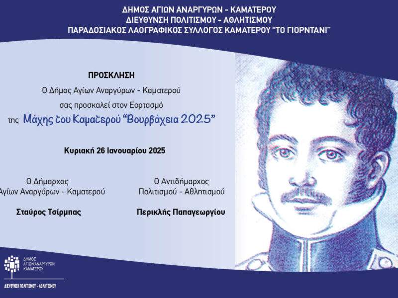 Ο Δήμος Αγίων Αναργύρων – Καματερού σας προσκαλεί στον Εορτασμό της Μάχης του Καματερού “Βουρβάχεια 2025”. Κυριακή 26 Ιανουαρίου 2025 στο Ιερό Ναό Αγ. Γεωργίου Πλατεία Ηρώων – Καματερό.