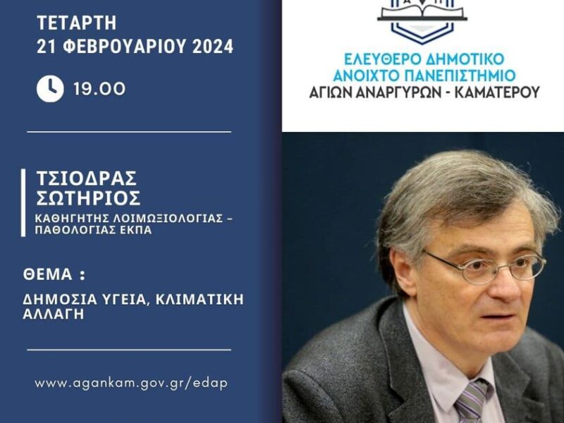 Η πρώτη διάλεξη του εαρινού κύκλου σπουδών του Ελεύθερου Δημοτικού Ανοικτού Πανεπιστημίου Αγίων Αναργύρων- Καματερού ξεκινάει την Τετάρτη 21 Φεβρουαρίου 2024 με τον γνωστό καθηγητή Λοιμωξιολογίας-Παθολογίας στο ΕΚΠΑ Σωτήρη Τσιόδρα.