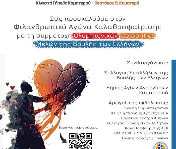 Ο Δήμος Αγίων Αναργύρων – Καματερού σε συνεργασία με τον Σύλλογο Υπαλλήλων της Βουλής των Ελλήνων, σας προσκαλεί στο Φιλανθρωπικό Τουρνουά Μπάσκετ, που διοργανώνεται για την ενίσχυση του Ιδρύματος ΘΕΟΤΟΚΟΣ.Η φιλανθρωπική εκδήλωση θα πραγματοποιηθεί την Κυριακή 8 Δεκεμβρίου και ώρα 18.00 στο Κλειστό Γήπεδο Καματερού (Θεοτόκου 9) με τη συμμετοχή Υπουργών και Βουλευτών, Ελλήνων Ολυμπιονικών καθώς και γνωστών celebrities.Αρωγοί της εκδήλωσης είναι η Ένωση Γονέων και Κηδεμόνων Αγίων Αναργύρων-Καματερού, η Ένωση Συμμετεχόντων σε Ολυμπιακούς Αγώνες (ΕΣΟΑ), το Εργατικό Κέντρο Αθηνών και ο Σύλλογος Παλαίμαχων Αθλητών Καλαθοσφαίρισης ΑΕΚ ΕΚΑ BASKET «Νίκος Γκάλης». Στόχος της εκδήλωσης είναι να ενώσουμε τις δυνάμεις μας για έναν ιερό σκοπό, προωθώντας την αλληλεγγύη και την κοινωνική προσφορά, καθώς όλα τα έσοδα θα διατεθούν για τις ανάγκες και το έργο του Ιδρύματος ΘΕΟΤΟΚΟΣ.Το κόστος της πρόσκλησης είναι συμβολικά στα 5 ευρώ.Μπορείτε να προμηθευτείτε προσκλήσεις από τους Συλλόγους Γονέων καθώς και από τη Διεύθυνση Παιδείας στο τηλέφωνο 2132023656.Ας στηρίξουμε όλοι αυτήν την ξεχωριστή προσπάθεια!